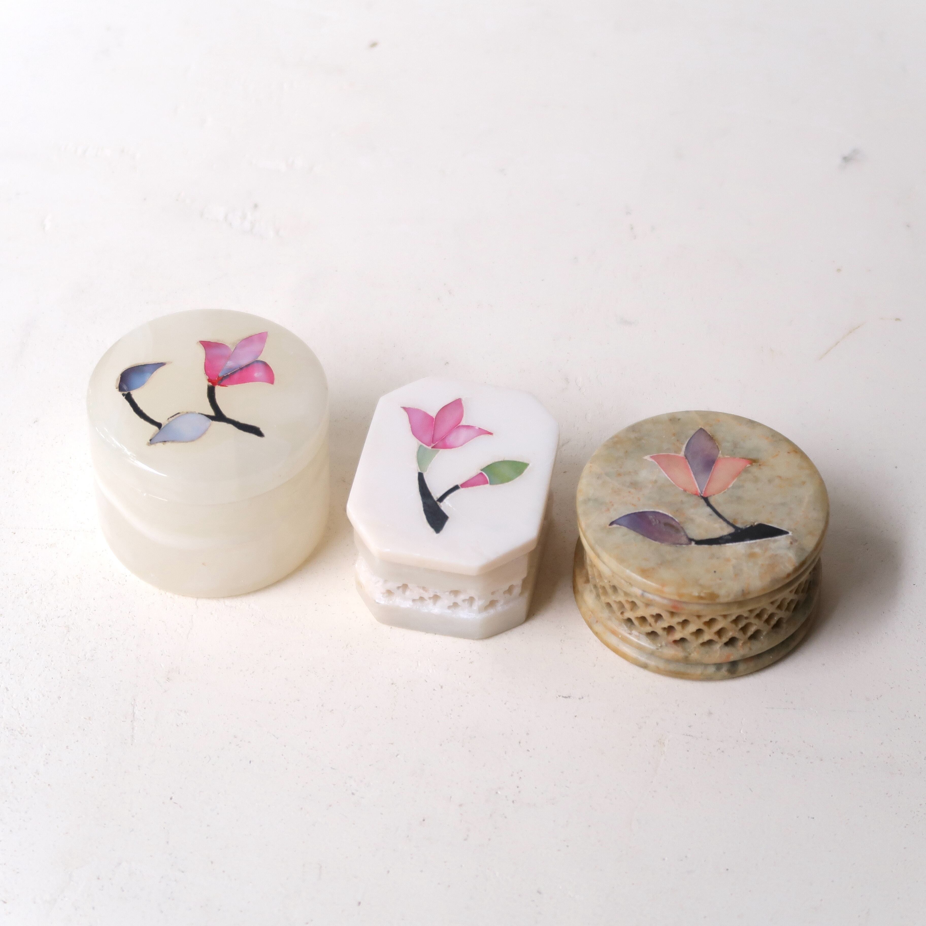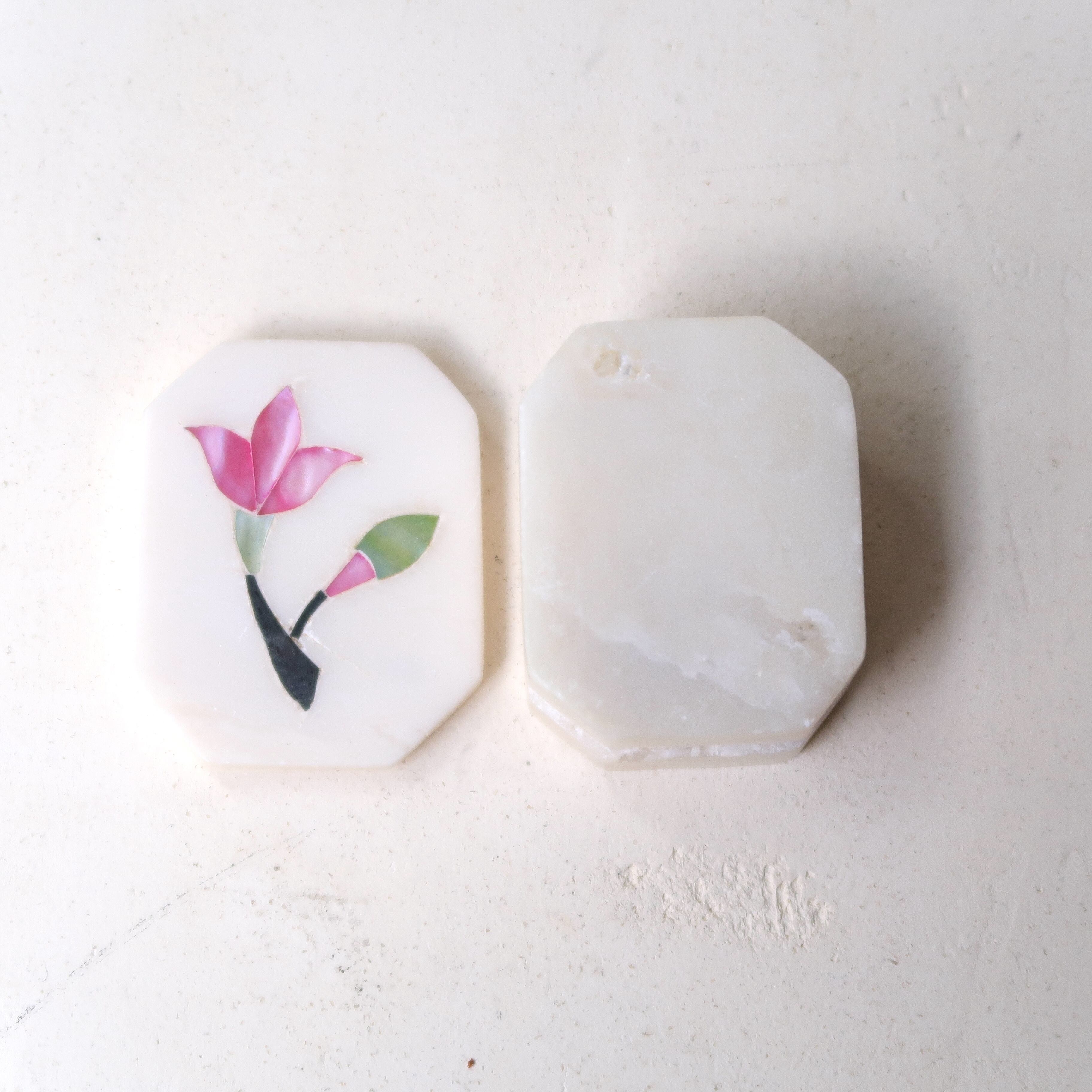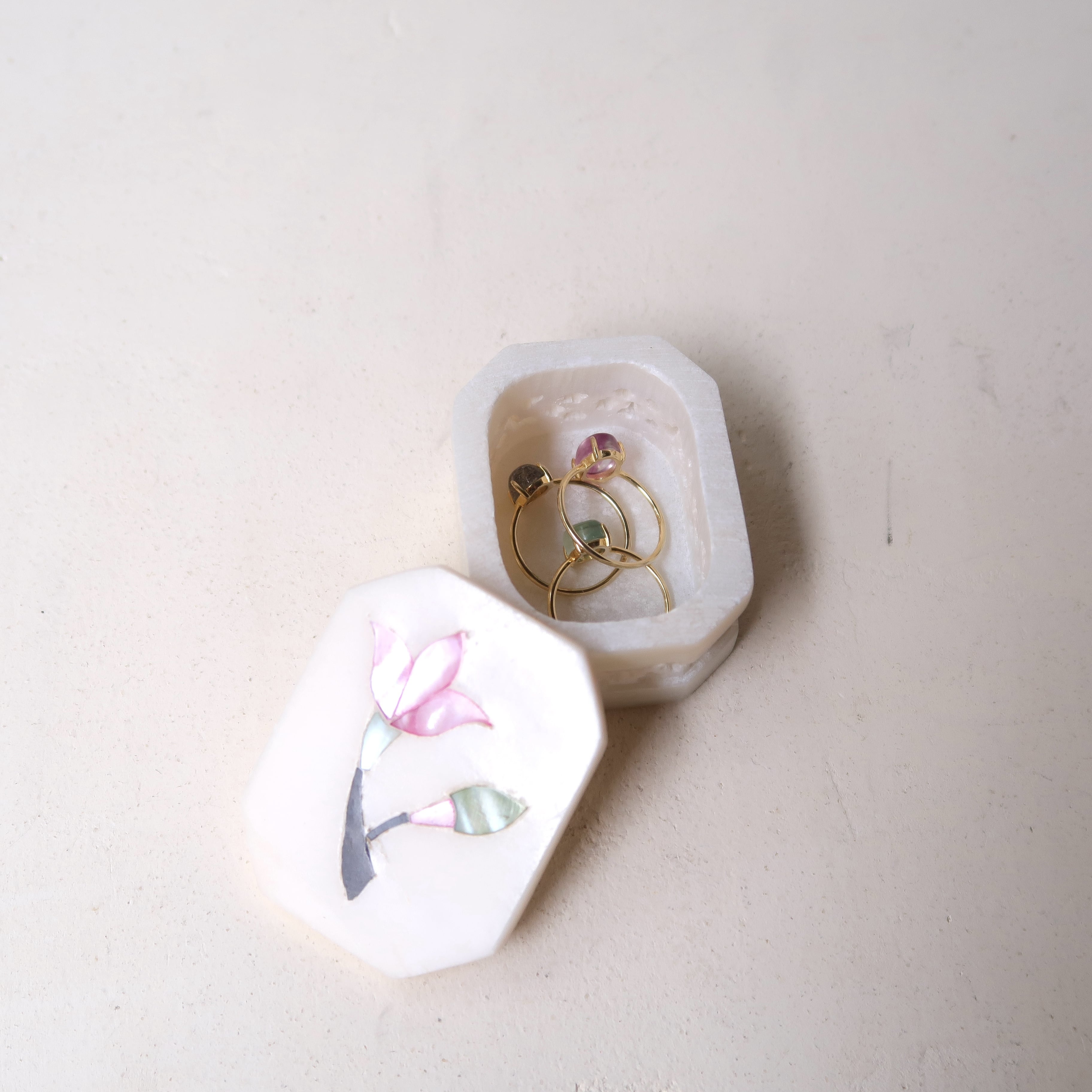 容器は石、お花は薄くスライスされた貝殻が埋め込まれています。白ベースの石に、ピンクの花びらと若葉のような明るいグリーンがキュンとくるかわいさ。
