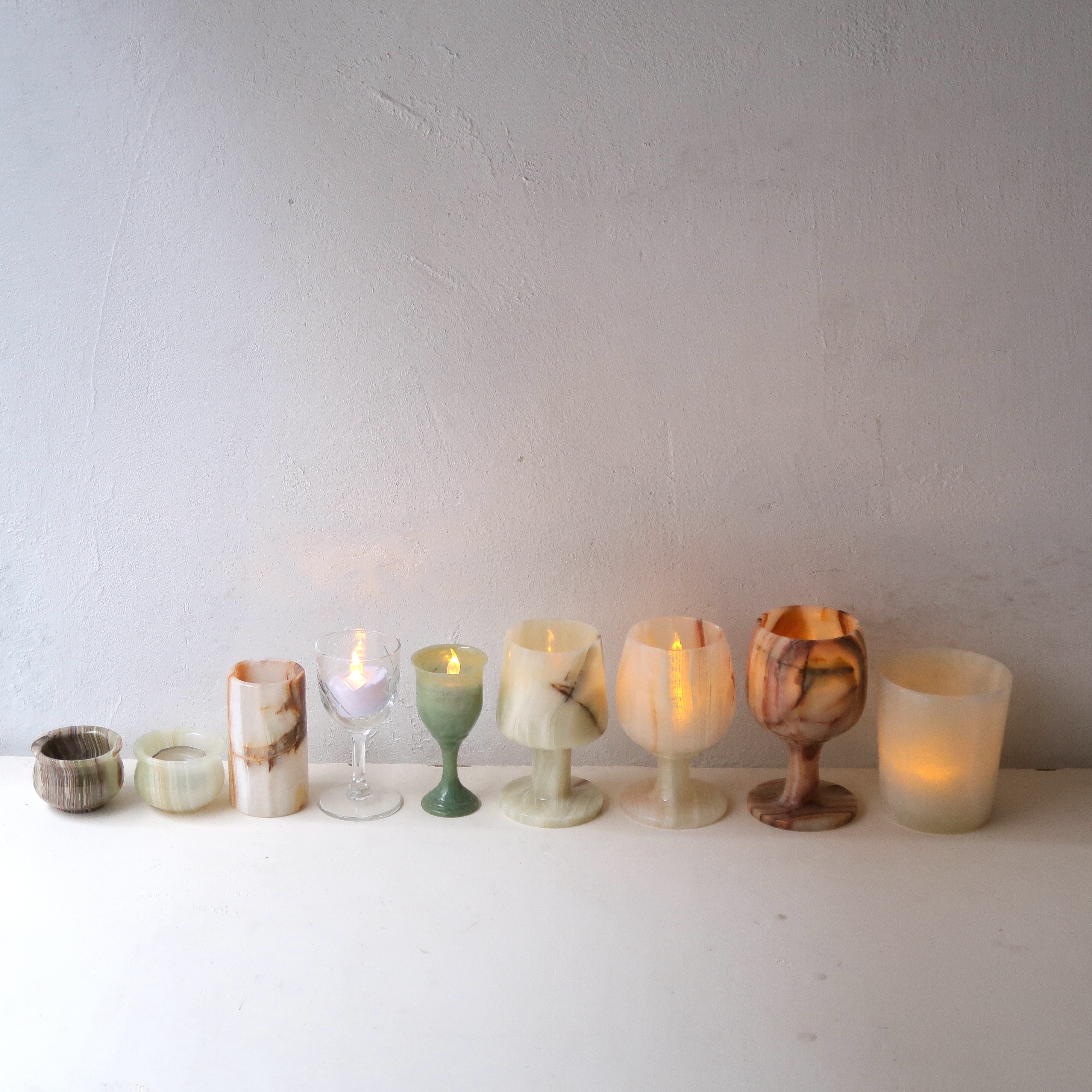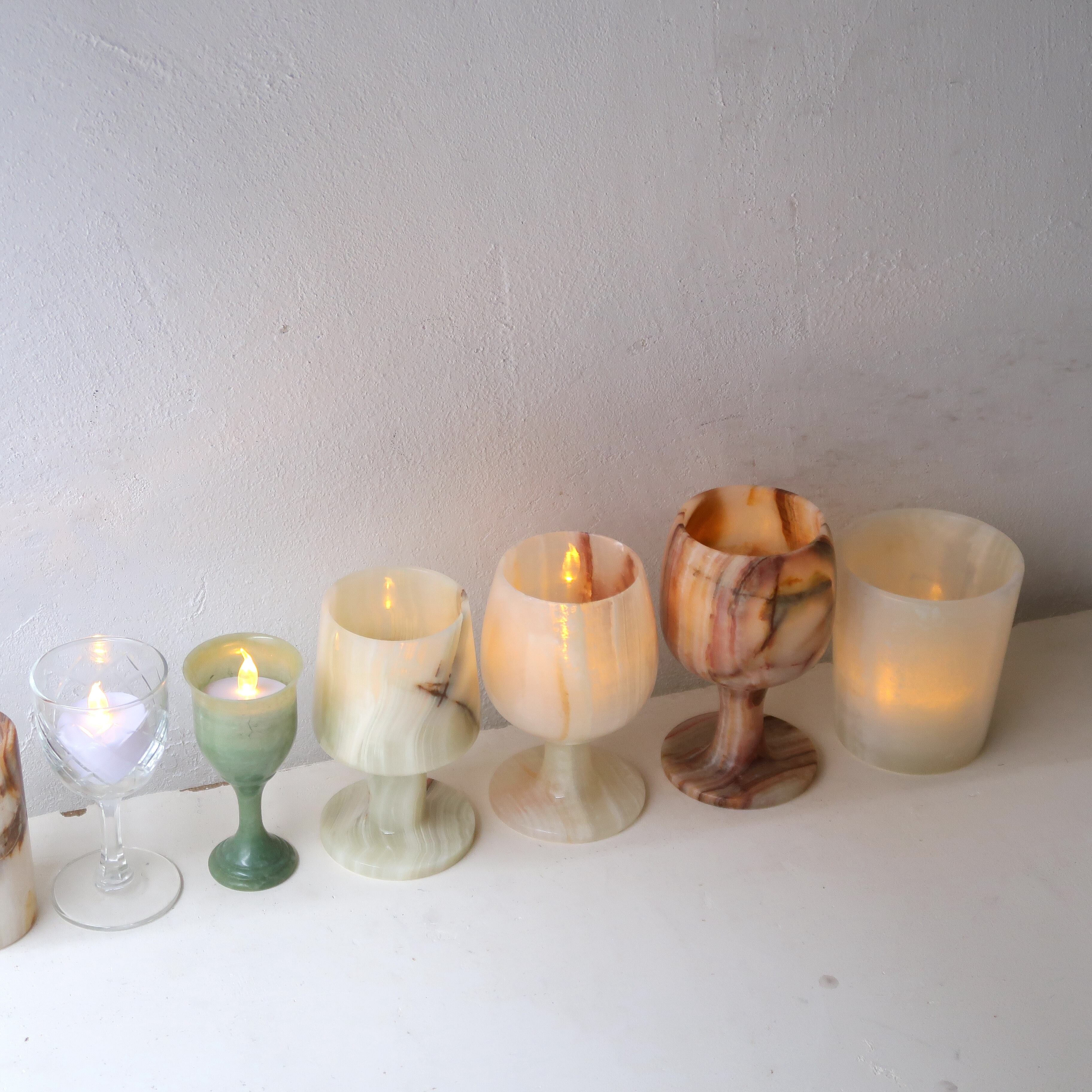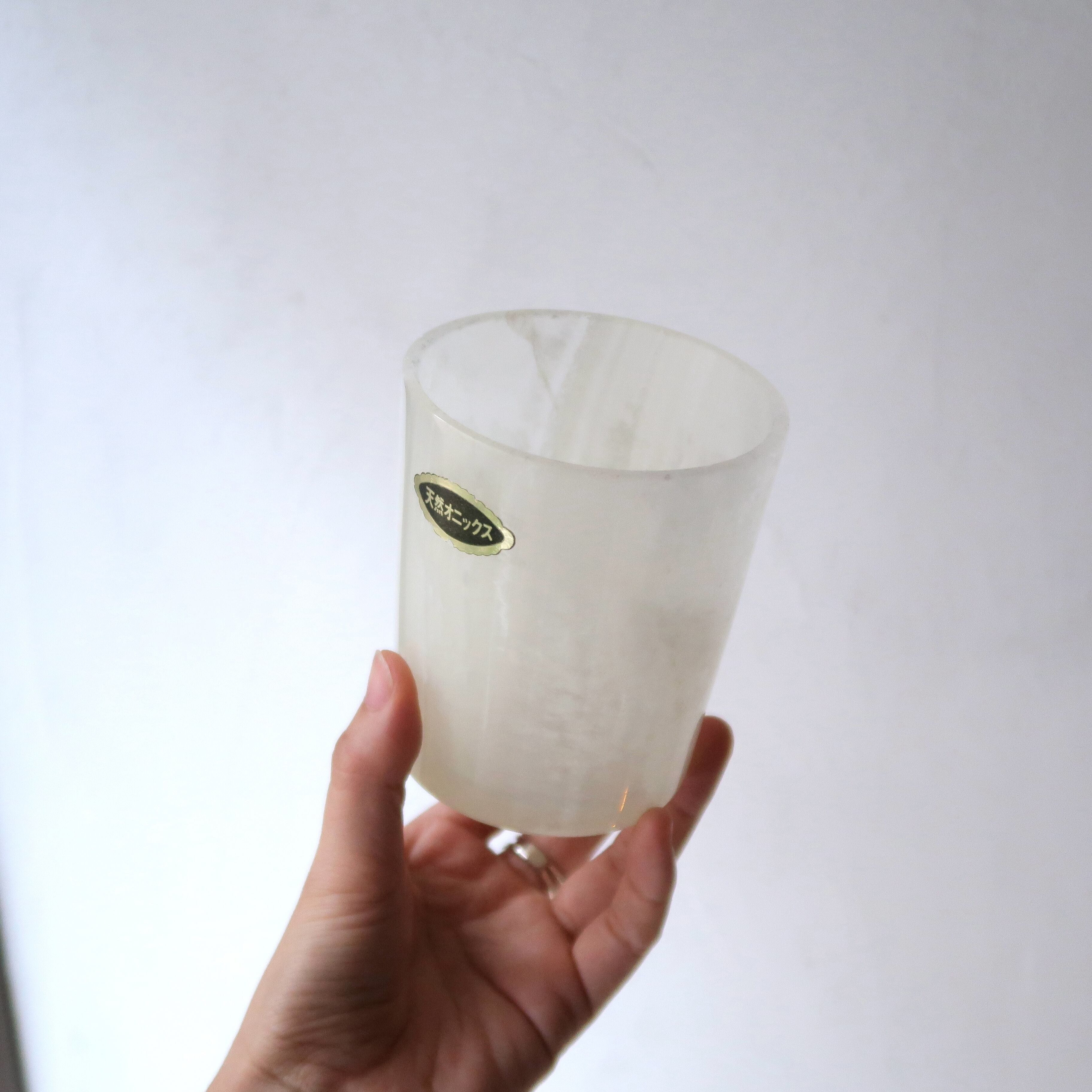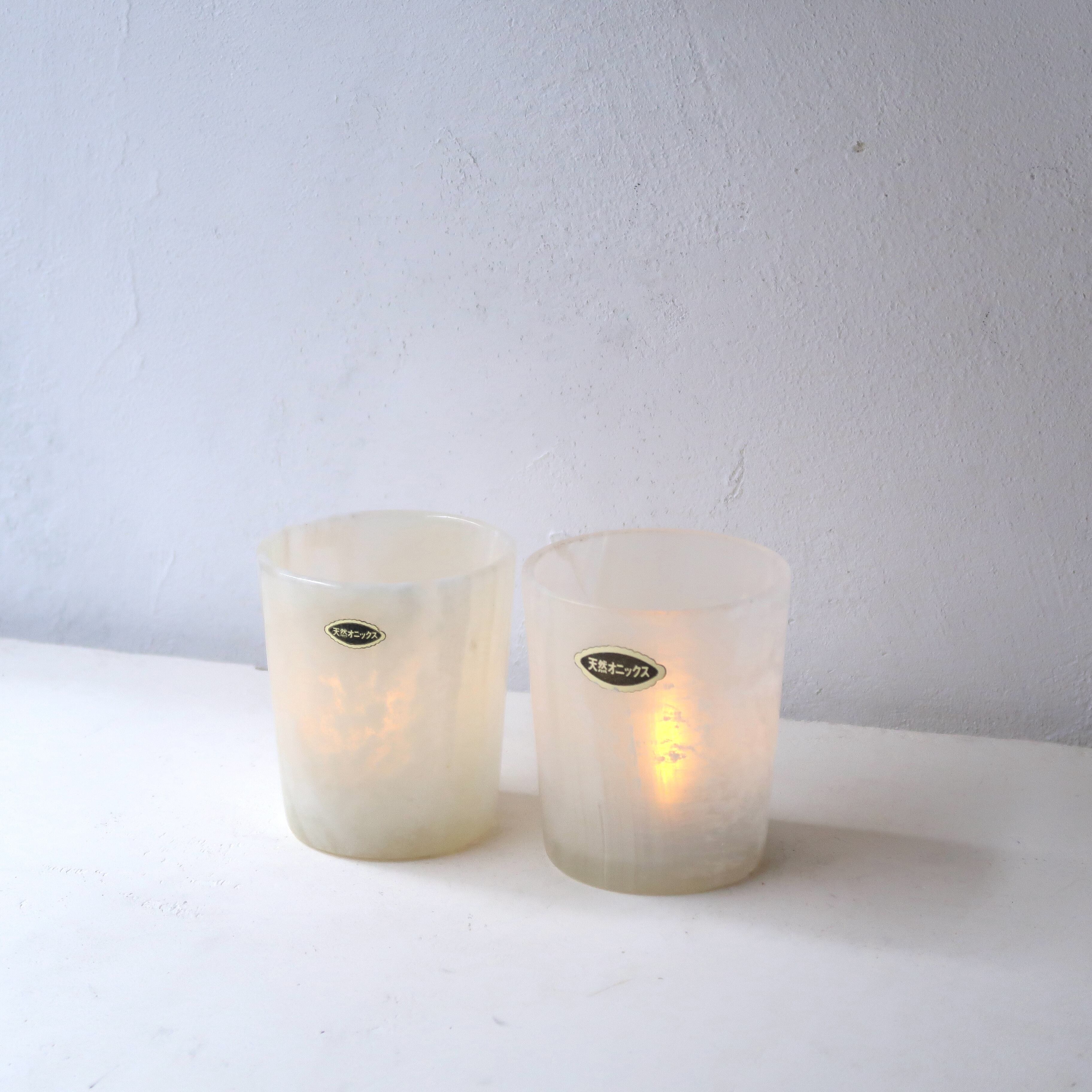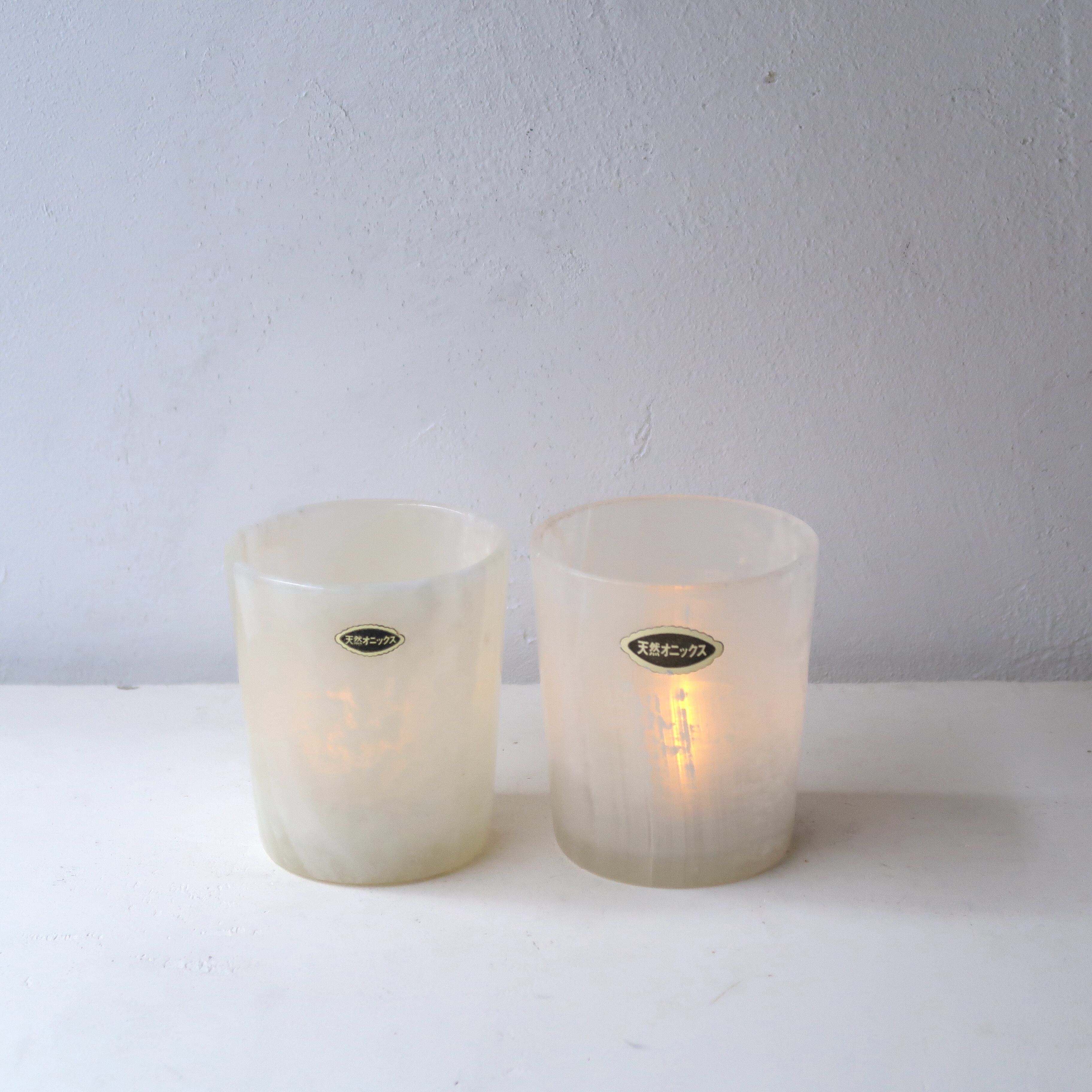 透明感のある白いオニキスのキャンドルホルダー。向こうが透けるくらいうすい質感がたまりません。