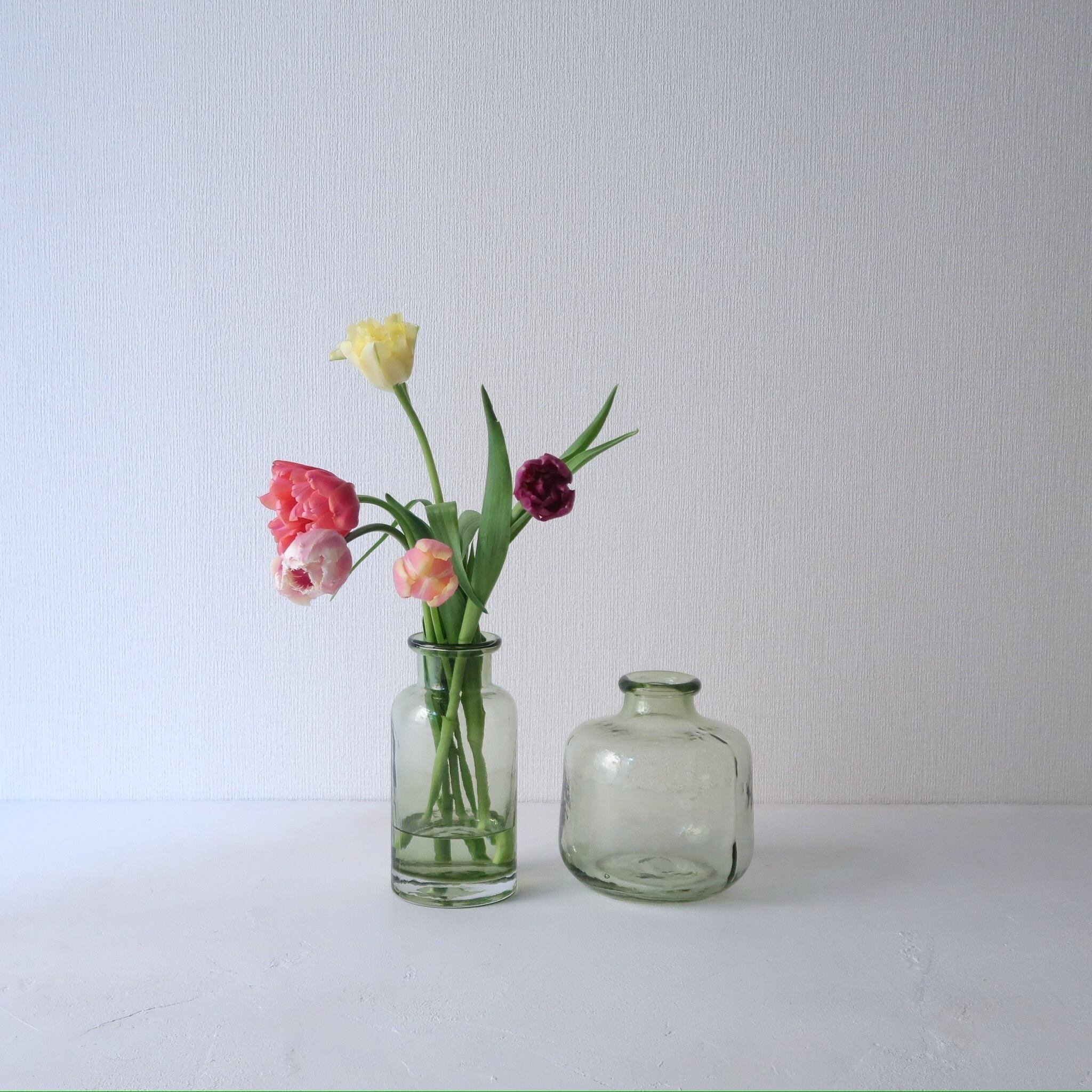 茎のグリーンと合うのでお花の色を選ばず使いやすいのがポイント。口がすぼまり、ころんとしたフォルムは茎が安定し飾りやすいです。