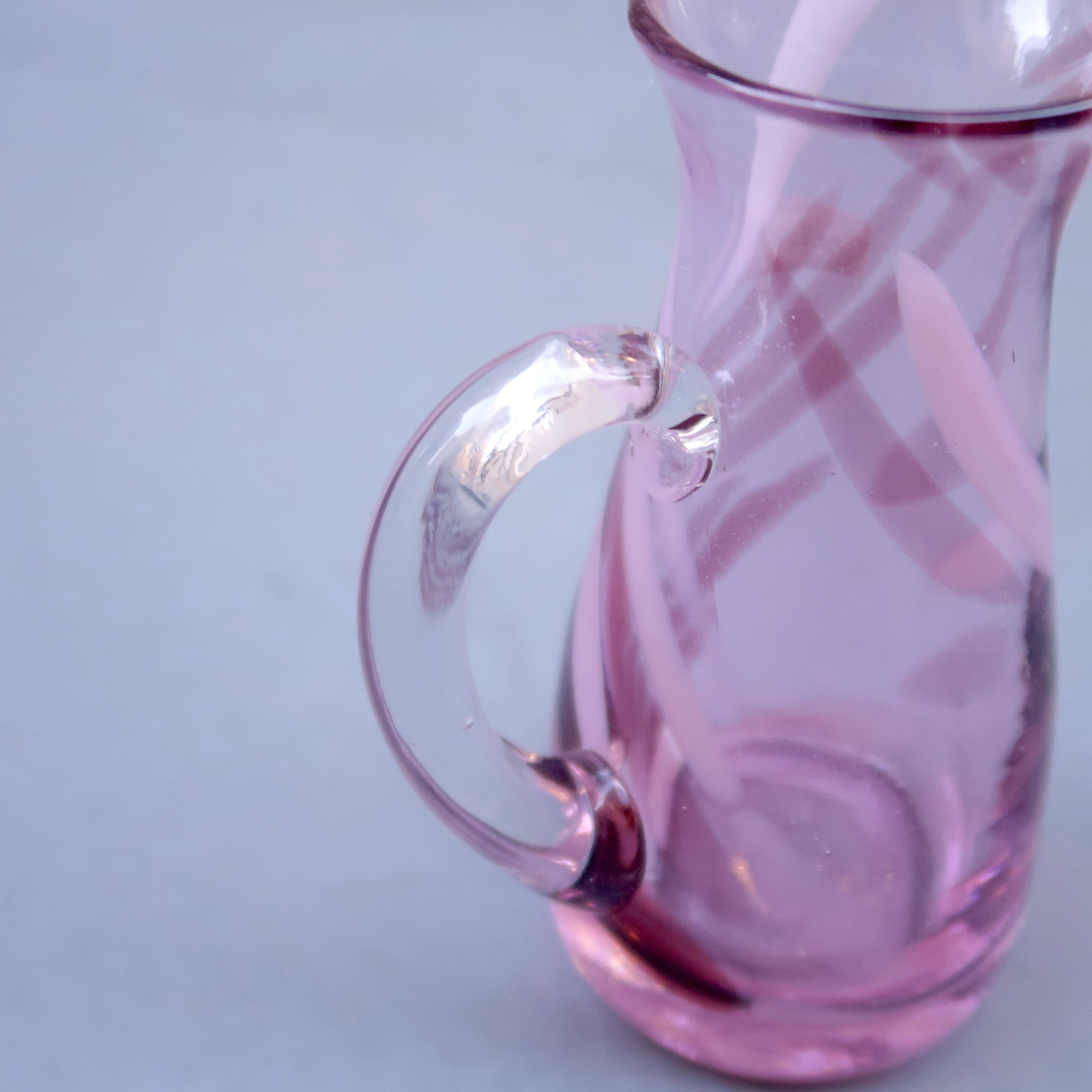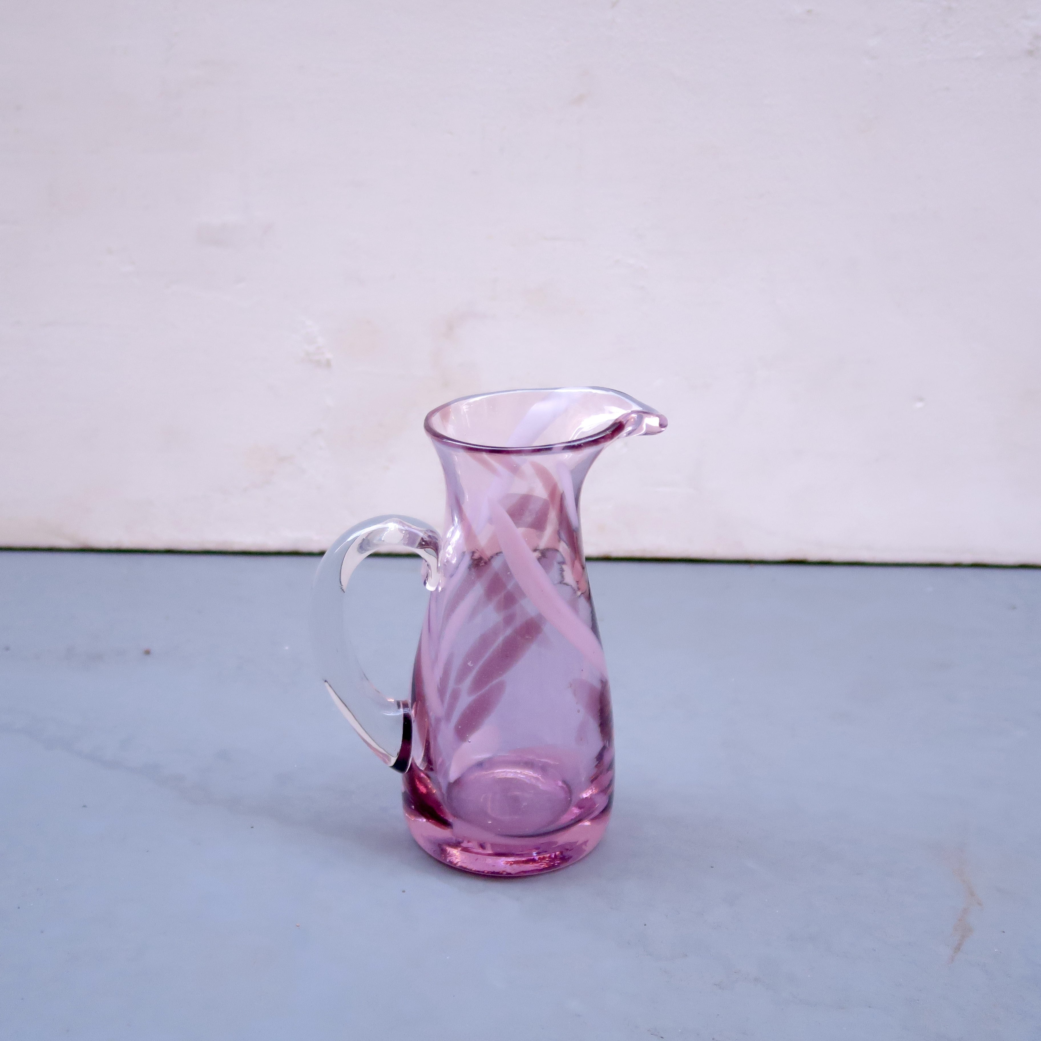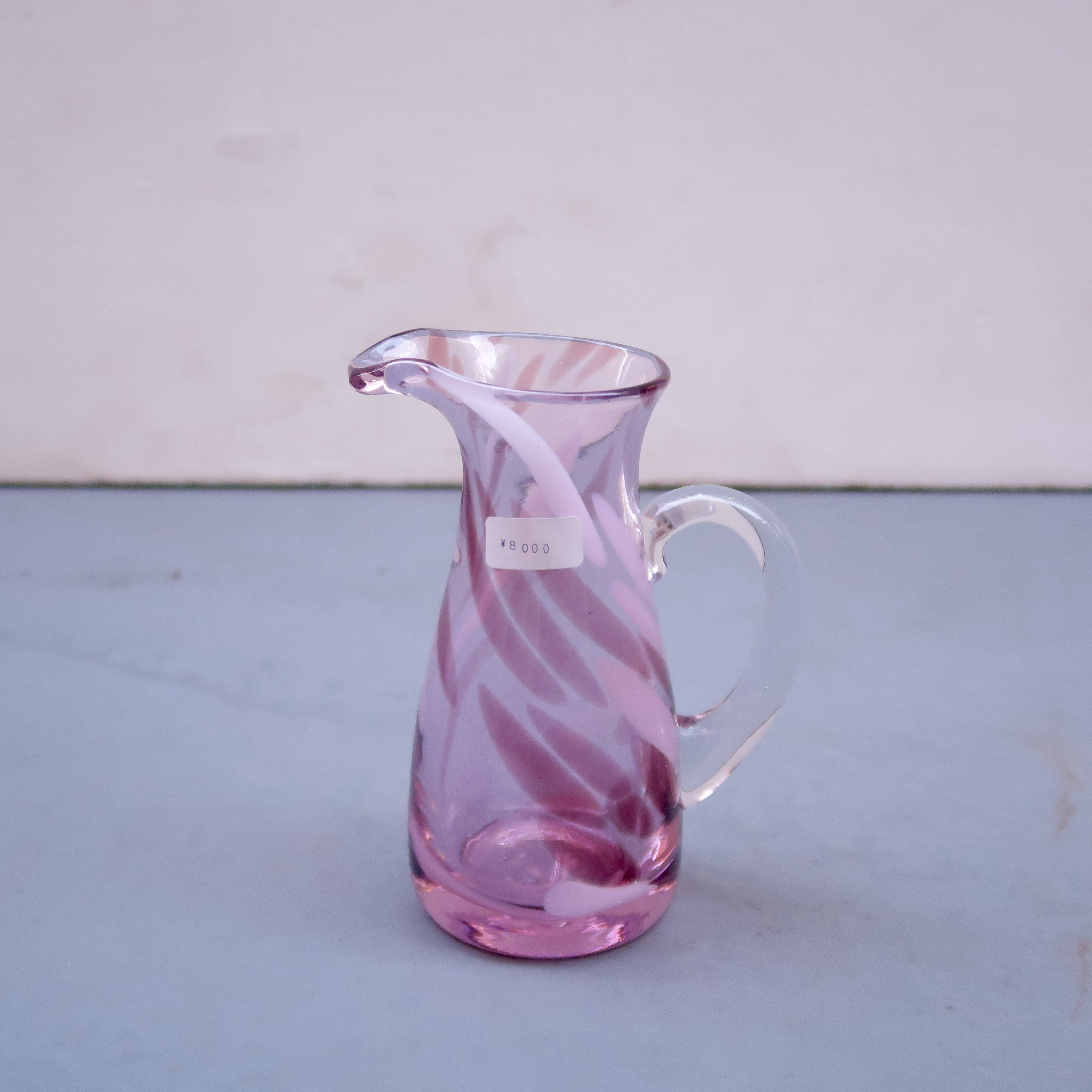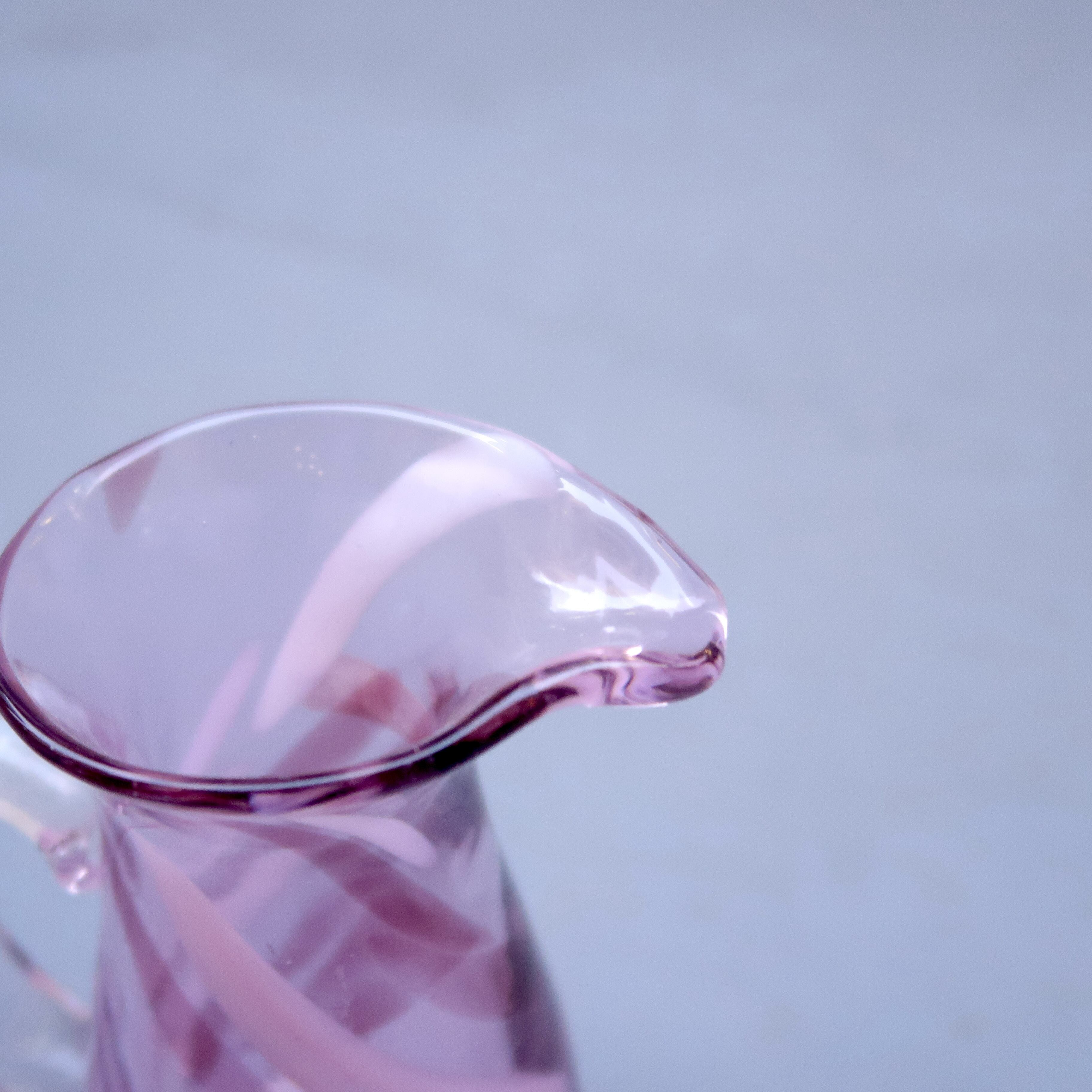 落ち着いたパープルピンクのガラスの水差し。パープルとホワイトのマーブルがぐるりと入った動きのある模様がかわいい。取手は透明です。