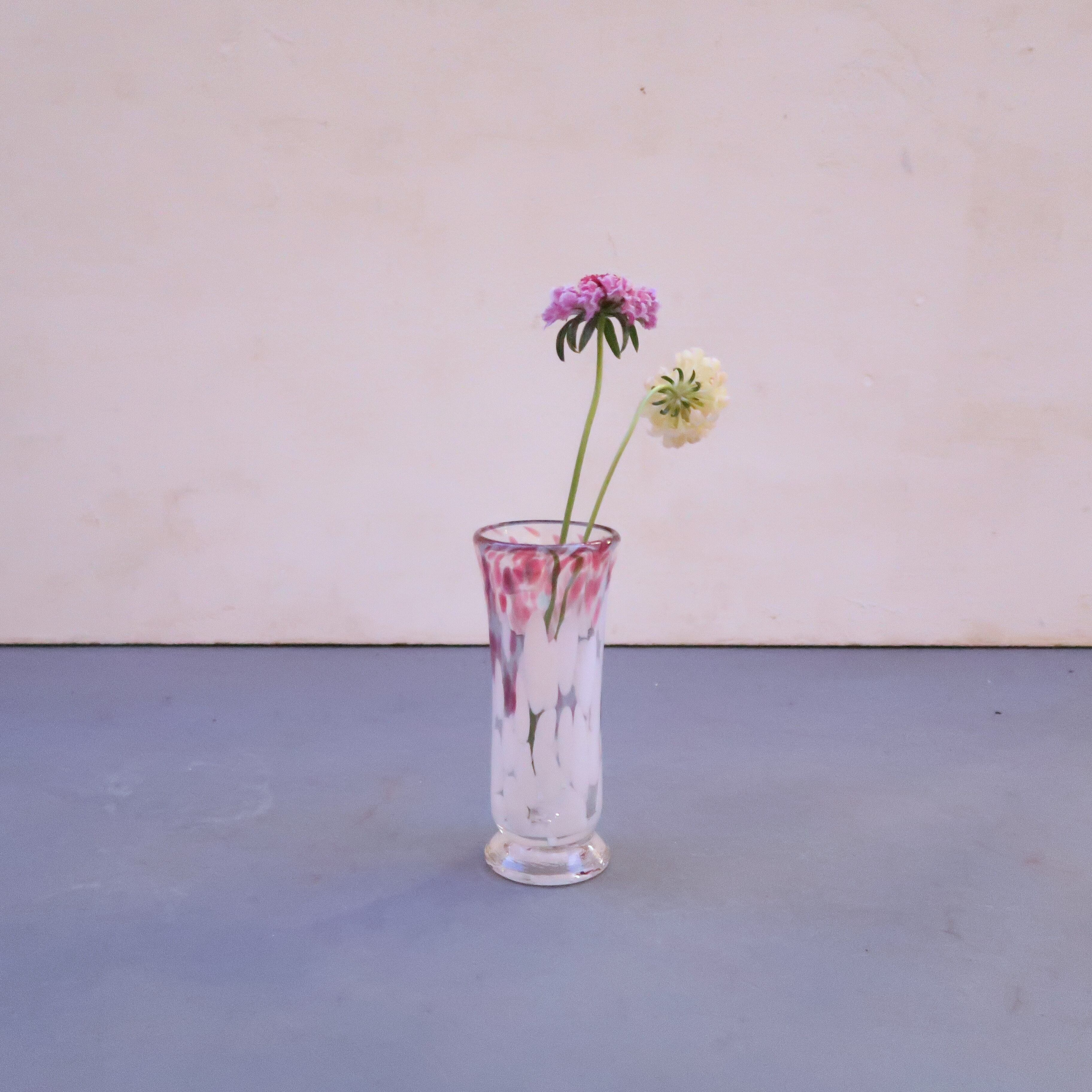 落ち着いたパープルピンクとホワイトのマーブルがかわいいガラスの一輪挿し。土台は透明です。