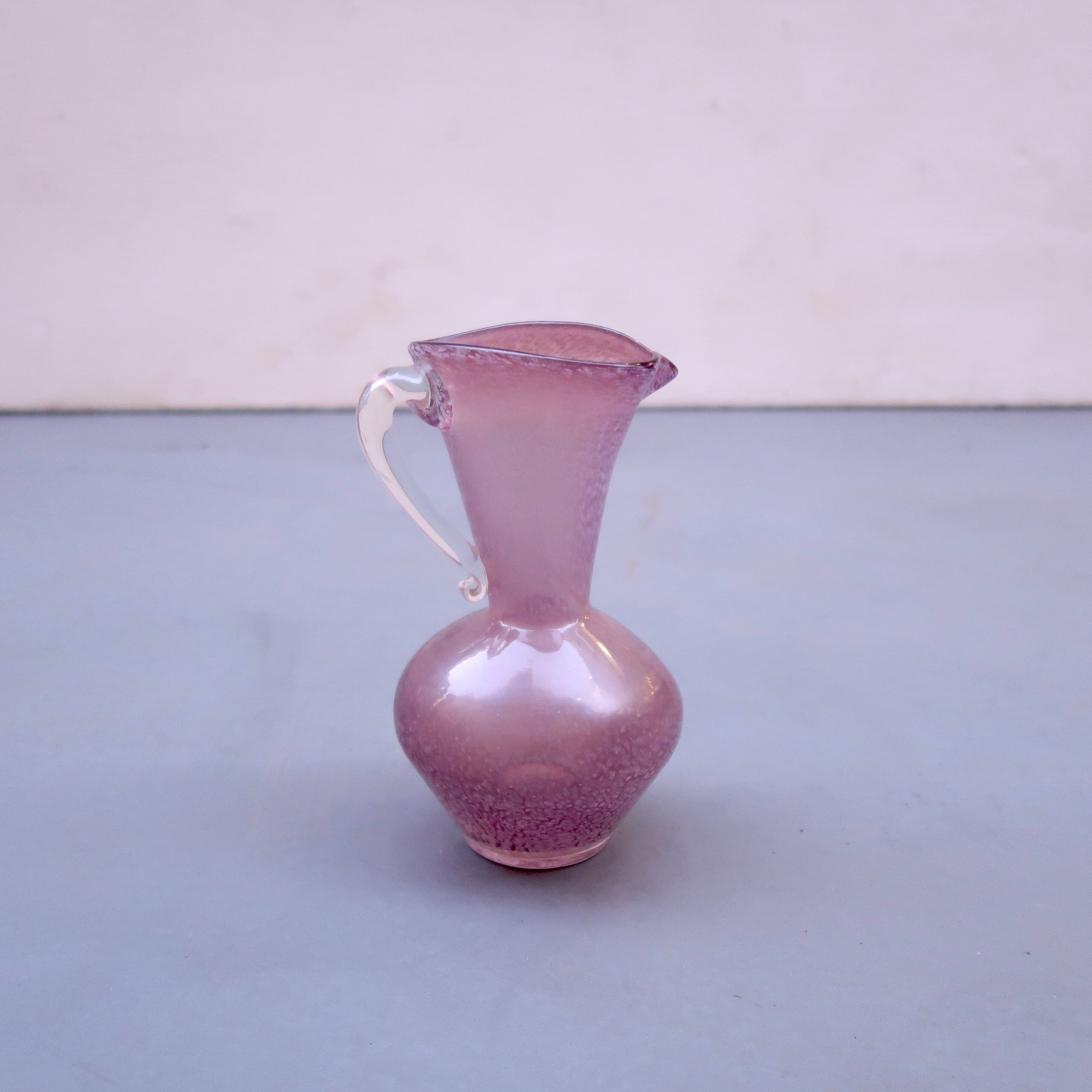 落ち着いたパープルピンクに、細やかなホワイトのマーブルが、まるで雪が降っているかのようなガラスの水差し。