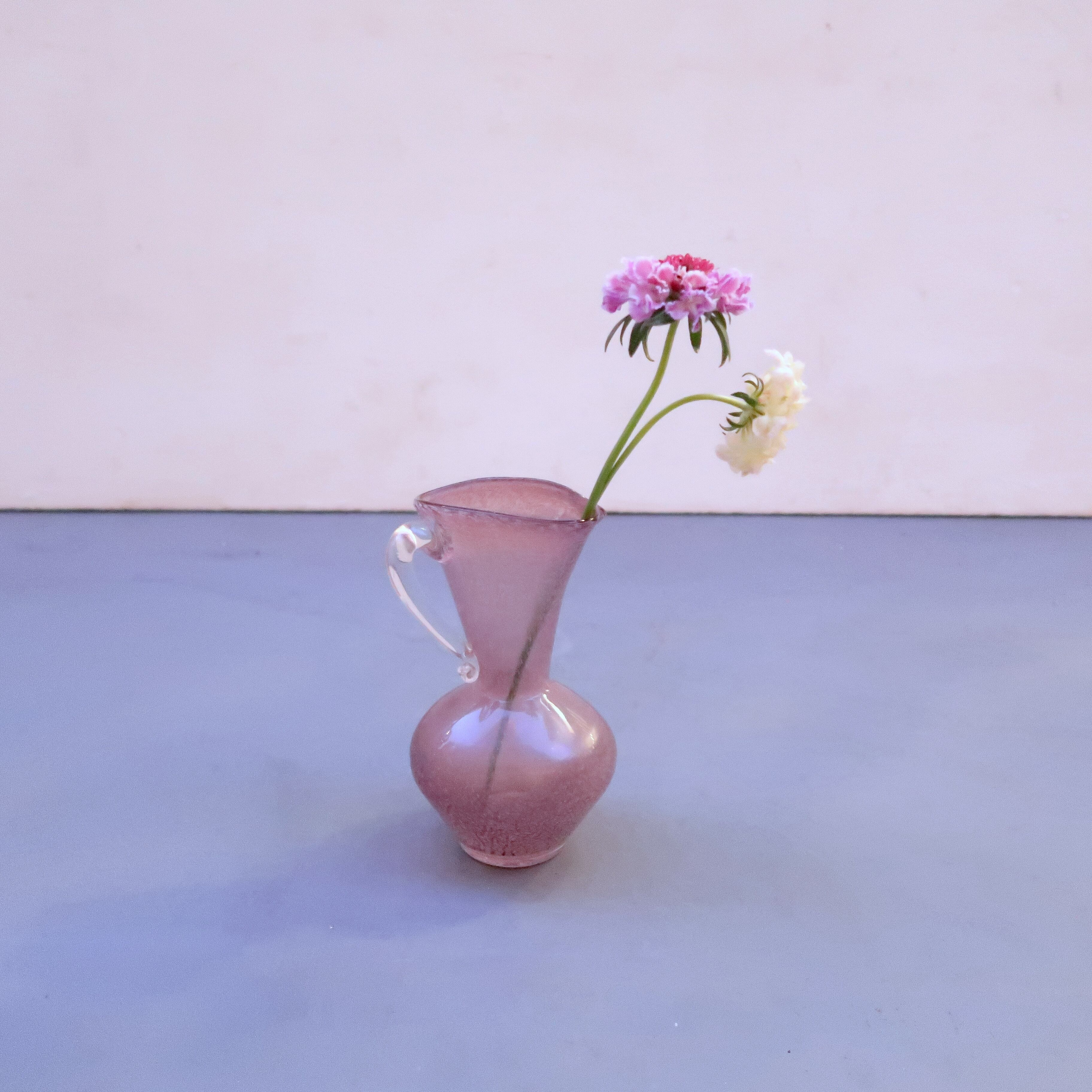 小ぶりの花瓶なので、ささやかなお花がよく似合います。取手はくるっとチャーミング。眺めていても美しいアイテムです。