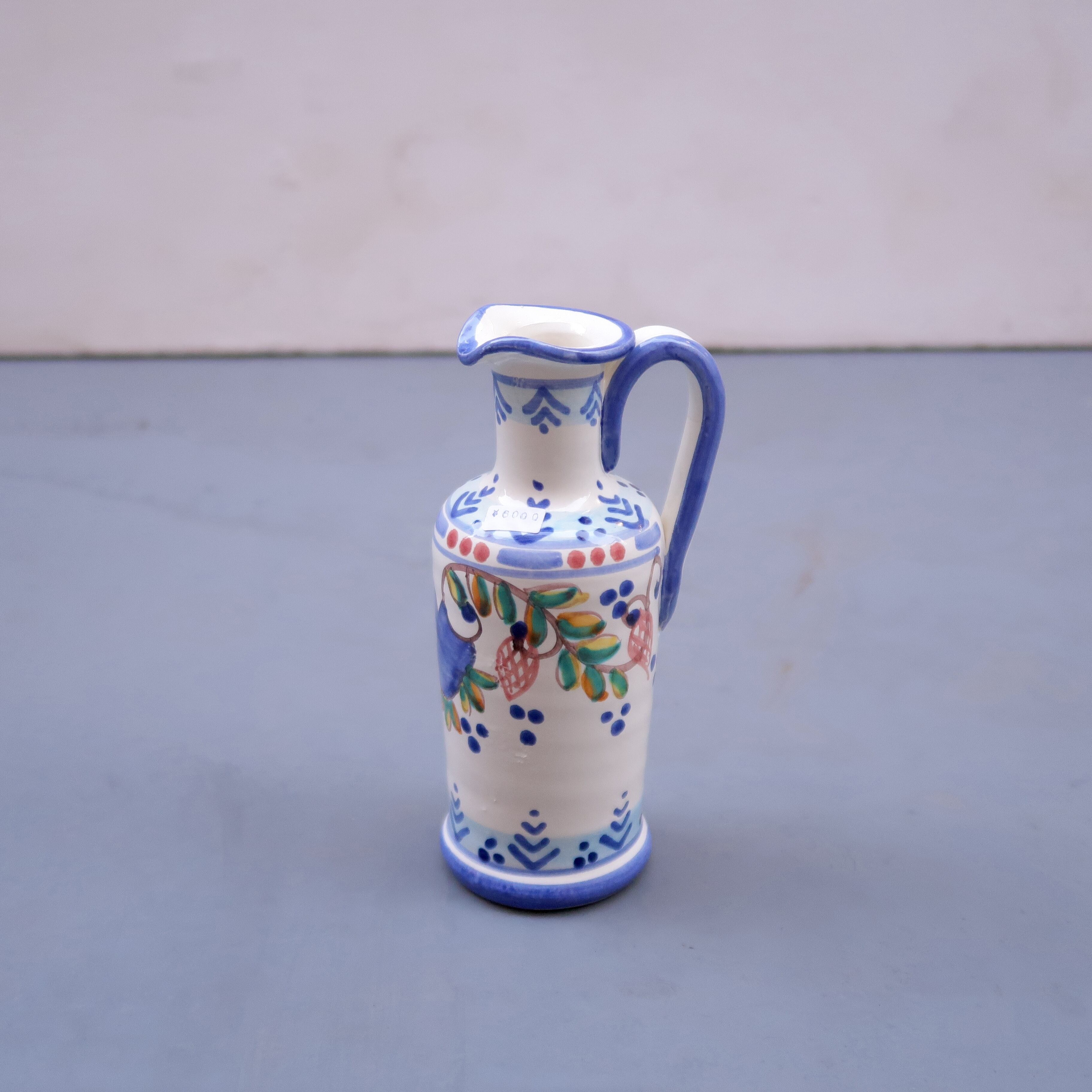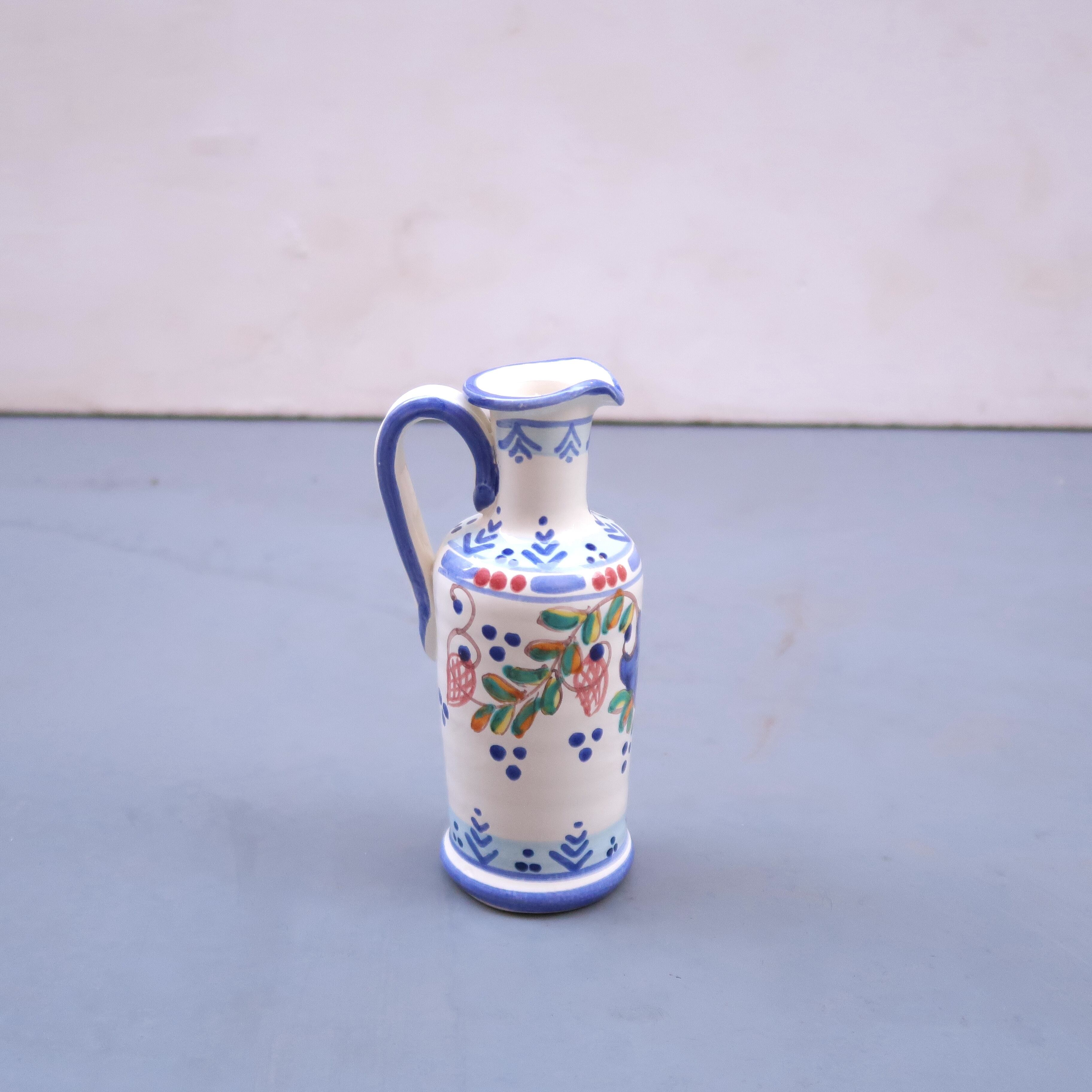 クリーミーな白に、ぱっきっとした青の縁取りがあざやかな陶器の水差し。レースのような実のような、草花が描かれた模様。イタリアかスペイン製のものだと思われます。旅をしたくなるような、異国情緒を感じるアイテム。